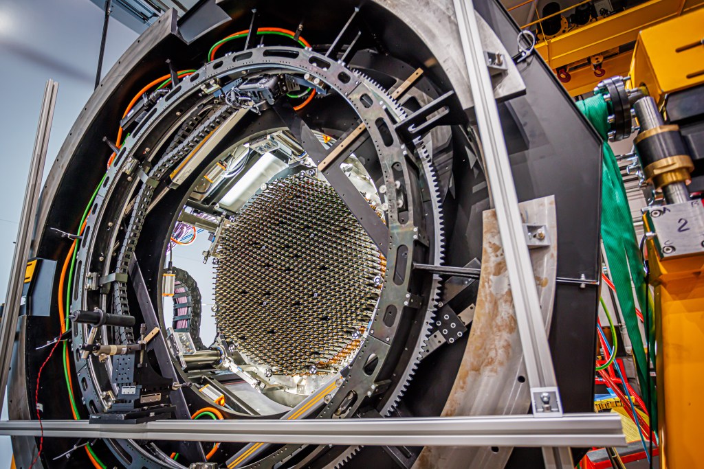 Unsurprisingly, coordinating the FPUs to ensure seamless operation is incredibly complicated. Two motors in each FPU manoeuvre them into the right position and, while the instrument software system tracks each one of these movements, there is a metrology system that works out exactly where each FPU is at any given time, when required. Twenty acquisition cameras send corrections to the telescope pointing to ensure that the FPUs are well aligned on the sky at all times. The rotating front end is also equipped with a calibration unit that can illuminate the fibres with well-known lamps, allowing astronomers to remove instrumental effects from their collected science data.