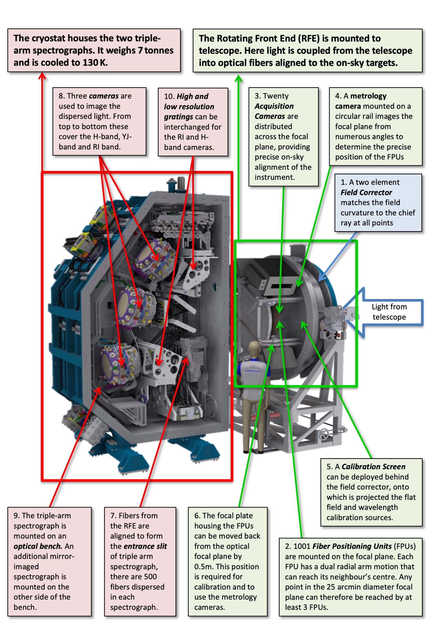 MOONS can be easily broken down into two main sections: the part that is mechanically attached to the telescope and couples the light into the optical fibers and then the static spectrograph wherein the light from the fibers is dispersed and recorded. MOONS differs from many of other large multi-object spectrographs as it is mounted on the telescope’s Nasmyth port as opposed to sitting at its prime focus.